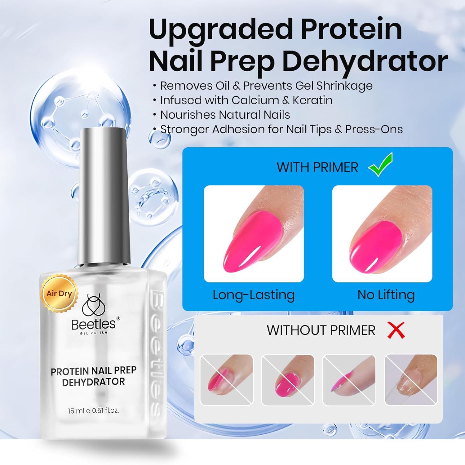 - Beetles 2 in 1 Protein Nail Dehydrator: Upgraded keratin formula, added 0.11% keratin, improves the adhesion of nail polish while nourishing your nails, making your nails healthier with use.Perfect for salon professionals and DIY users who want stronger adhesion and longer-lasting nails.