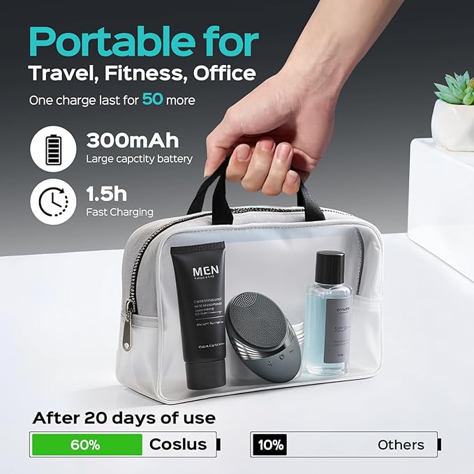 - Waterproof and Travel-Ready for Active Lifestyles: Built with an IPX7 waterproof rating, the COSLUS face scrubber is safe to use in the shower or at the sink. Its compact and cordless design fits easily in your gym bag or carry-on, making it the ideal companion for frequent travelers, business professionals, or backpackers on the go. Whether you're prepping your skin before a meeting or refreshing it after a long flight, this portable Face Scrubber supports consistent deep cleansing and massage benefits, helping your skin stay refreshed anywhere—even on the road