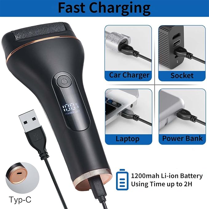 - [LCD Power Display & Rechargeable Long Lasting]Our electric foot file features a 2000mAh lithium battery with overcharge protection and an LCD battery display, allowing you to monitor battery life easily. With 3 hours of USB-C charging, you'll get up to 240 minutes of minutes using.