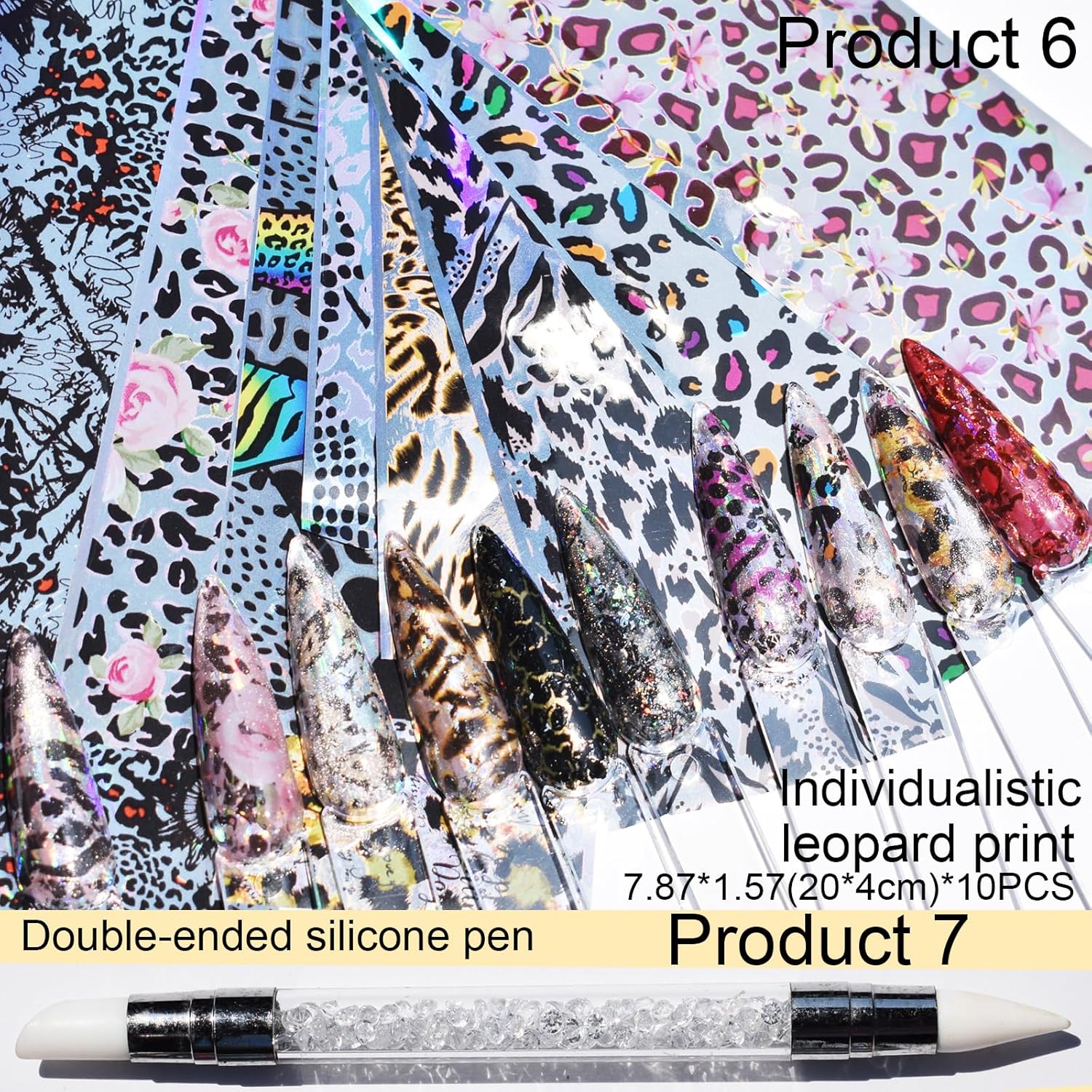 - COMPLETE SET: 60 pieces of nail art transfer foils in various designs including dried flowers, iridescent effects, animal prints, marble patterns, and checkered patterns,1 Pcs nail art double-headed silicone nail tool.