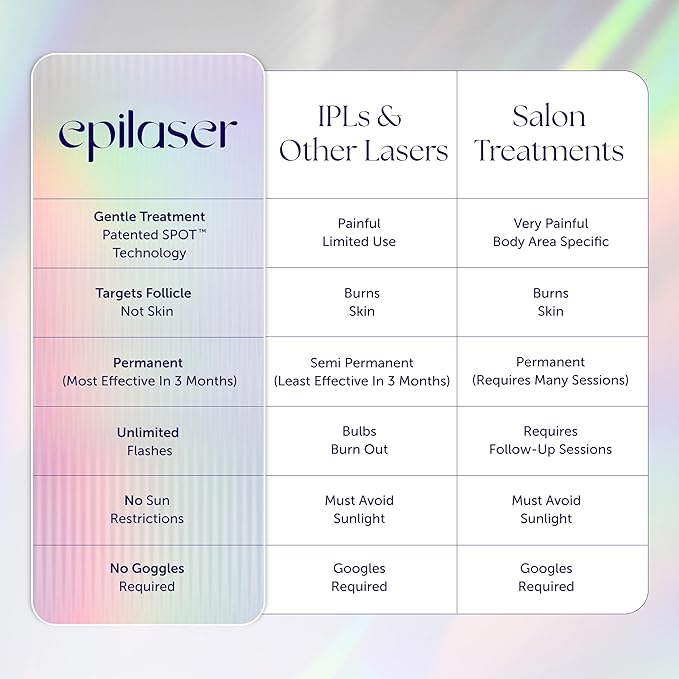 - SAFE: Epilaser’s ultra-gentle lasers don’t affect skin, eliminating the need to stay indoors after treatment. No sun restrictions. No cooling gels. Just silky-smooth results that don’t slow you down.