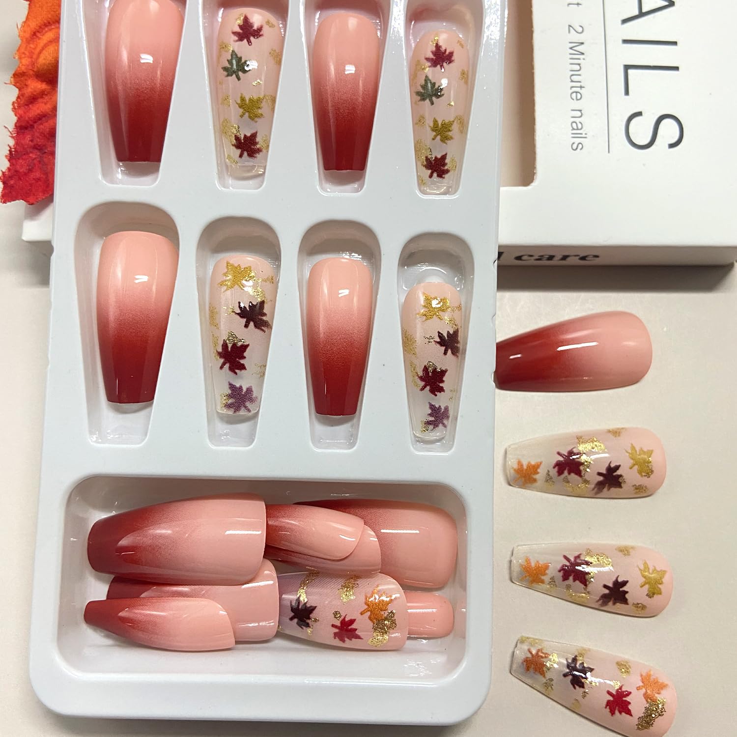 - Easy to Use: Instead of spend lots time and money at nail salon, you can change you nails style in 15 minutes anytime and anywhere. The maple leaves fake nails will stay longer if you clean your nails before use, and avoid water within the first hour of wearing